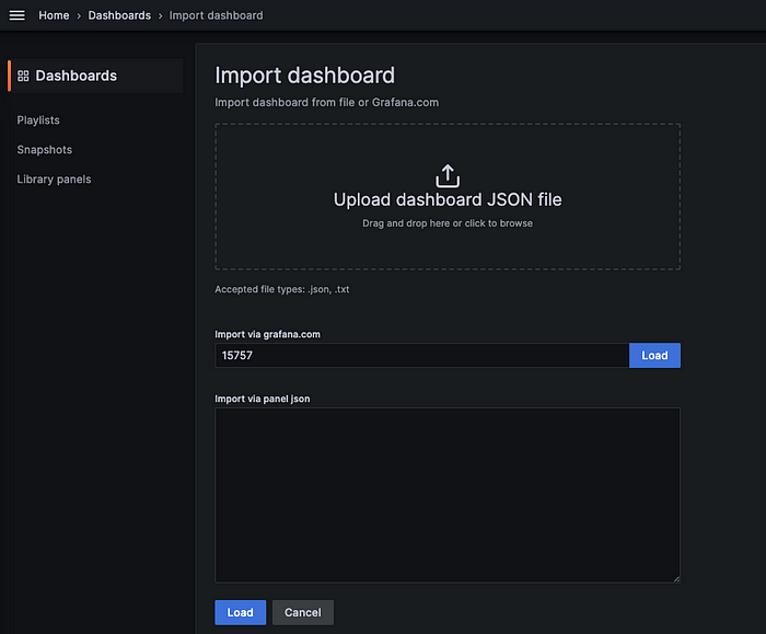 - Dashboard → New → Import : 원하는 대시보드 입력(예: 15757, 13770, 1860, 15172, 13332, 16032 등)