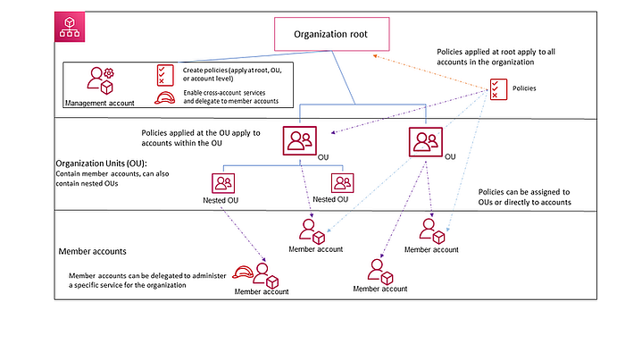 - Root : 조직의 모든 계정에 대한 상위 컨테이너입니다. 정책을 루트에 적용하면, 해당 정책은 조직의 모든 조직 단위(OU)와 계정에 적용됩니다.