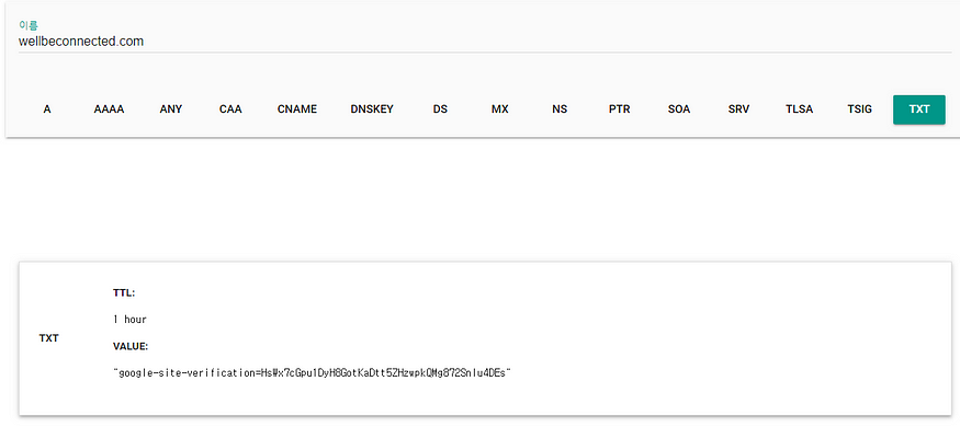 주의 : 등록한 도메인에 네임서버와 호스팅 영역의 네임서버(NS) 값이 일치하는지 확인합니다. 현재 도메인의 DNS를 조회하기 위해 아래 사이트에서 쿼리 응답이 제대로 오는지 확인할 수 있습니다.(Dig(DNS) 조회: 참고)