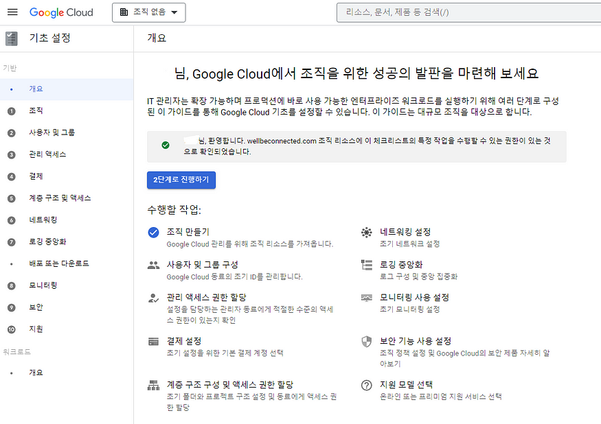 위에서 보호 설정한 도메인을 가지고 Google Cloud 조직을 만들어보겠습니다.
