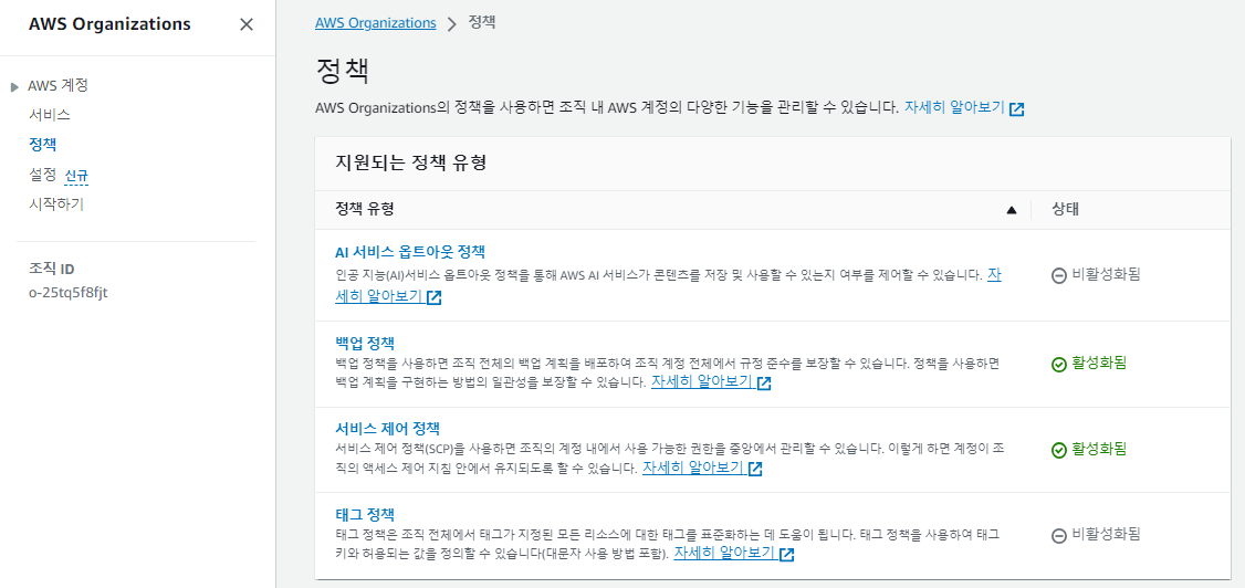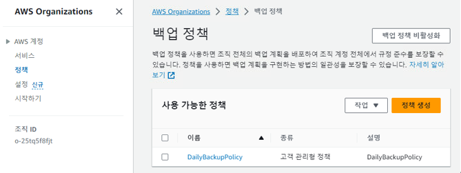 - 아래와 같이 Organization - 정책 - 백업 정책을 활성화해줍니다.