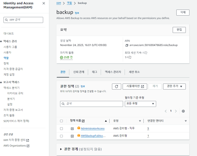 5. 연동할 계정에 백업 정책에서 설정해준 IAM 역할을 넣어줍니다.