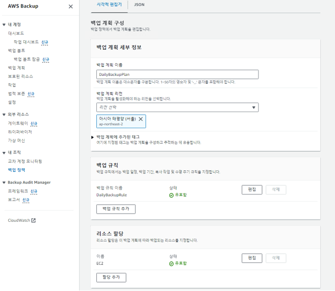 - 백업 계획 및 백업 규칙, 리소스를 할당해줍니다.