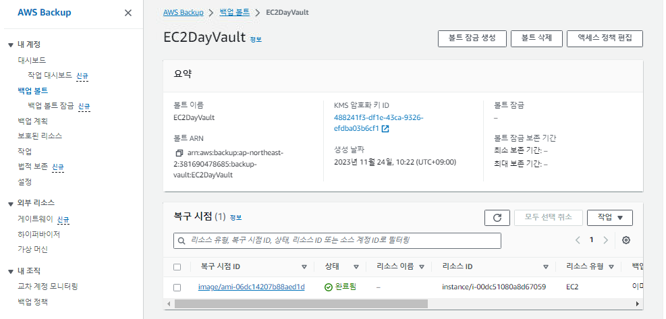 조직의 백업 정책이 연동된 계정에서 백업이 정상적으로 이뤄지는 것을 확인할 수 있습니다. 보다 자세한 내용은 AWS Organization 백업 정책 공식문서를 참고해주세요.