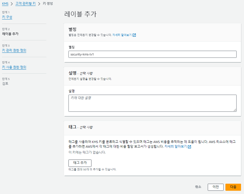 우선 위 설명과 같이 다른 계정(B계정)에서 사용할 KMS 키를 A 계정에서 생성해줍니다.