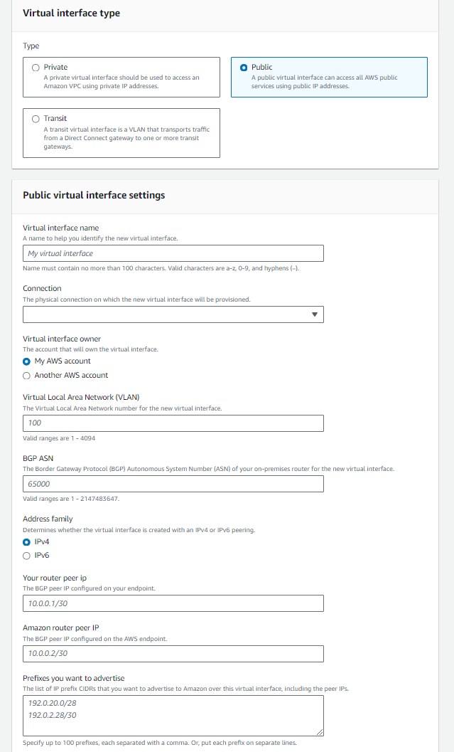 | Connection | 가상 인터페이스를 생성하려는 AWS Direct Connect 연결 또는 링크 집계 그룹(LAG)입니다. |