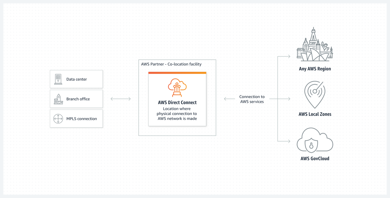 | 전용 연결 | AWS Direct Connect 파트너 또는 네트워크 공급자와 협력하여 데이터 센터, 사무실 또는 코로케이션 환경에서 AWS Direct Connect 위치까지 라우터를 연결할 수 있습니다. 네트워크 공급자는 AWS Direct Connect 파트너가 아니어도 사용자를 전용 연결에 연결해 줄 수 있습니다. AWS Direct Connect 전용 연결은 단일 모드 광섬유를 통해 1Gbps: 1000BASE-LX(1310nm), 10Gbps: 10GBASE-LR(1310nm), 100Gbps: 100GBASE-LR4의 포트 속도를 지원합니다. |