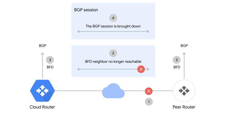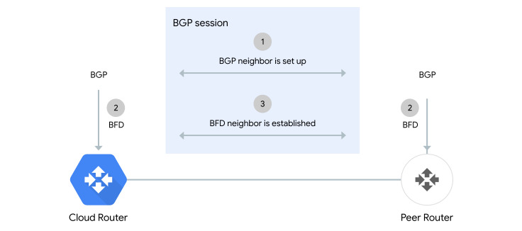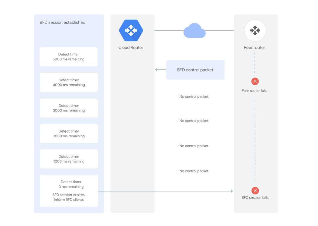 Cloud Router는 피어 라우터와 협상하고 피어 라우터에서 1,000ms마다 제어 패킷을 수신할 것으로 예상합니다. Cloud Router가 제어 패킷을 수신하지 않고 5,000ms가 지나면 감지 타이머가 만료되고 BFD 세션이 다운된 것으로 선언합니다.