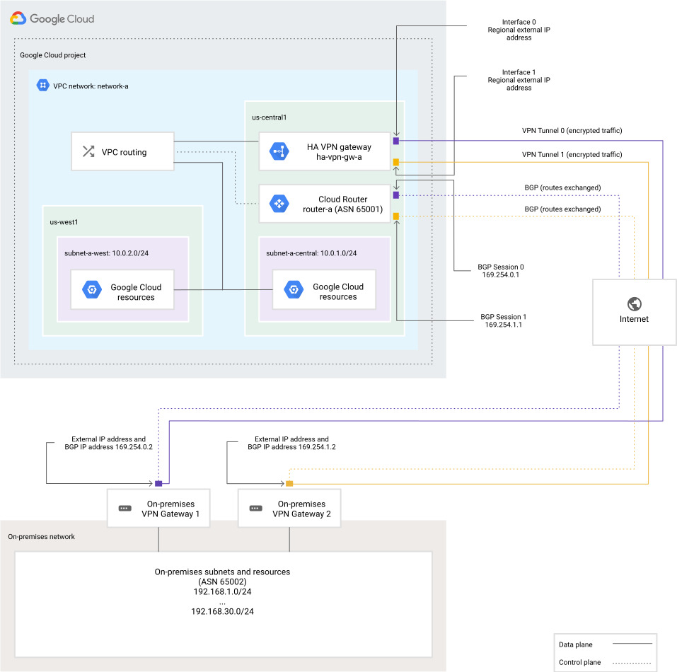 HA VPN은 IPsec VPN 연결을 통해 온프레미스 네트워크를 VPC 네트워크에 안전하게 연결할 수 있는 고가용성(HA) Cloud VPN 솔루션입니다. HA VPN은 토폴로지 또는 구성 시나리오에 따라 99.99% 또는 99.9%의 가용성 SLA를 제공할 수 있습니다.