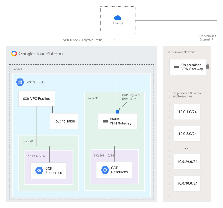 Cloud VPN은 IPsec VPN 연결을 통해 Peer 네트워크를 가상 프라이빗 클라우드(VPC) 네트워크에 안전하게 확장합니다. VPN 연결은 암호화를 처리하는 VPN 게이트웨이 하나와 복호화를 처리하는 다른 VPN 게이트웨이로 네트워크 간에 이동하는 트래픽을 암호화합니다. 이를 통해 전송 중에 데이터를 보호합니다. 공개 인터넷으로 트래픽을 라우팅하는 Cloud VPN을 사용할 수 없습니다. Cloud VPN은 비공개 네트워크 간의 보안 통신을 위해 설계된 것입니다.