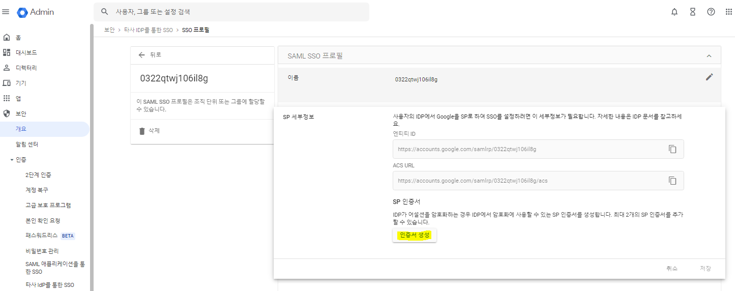 - Google 관리 콘솔(admin.google.com)에서 메뉴 보안 > 인증 > 서드 파티 IdP를 통한 SSO을 확인하세요.