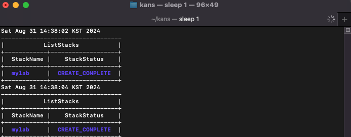 # aws cloudformation deploy --template-file kans-1w.yaml --stack-name mylab --parameter-overrides KeyName=<My SSH Keyname> SgIngressSshCidr=<My Home Public IP Address>/32 --region ap-northeast-2