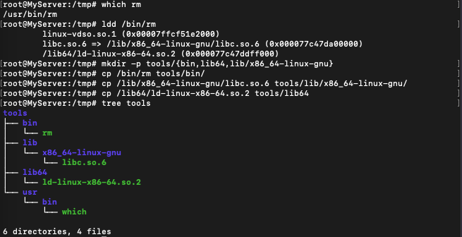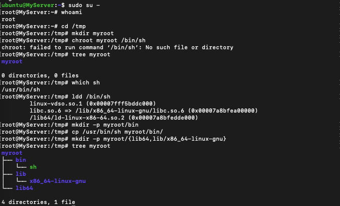 cp /lib64/ld-linux-x86-64.so.2 /tmp/myroot/lib64/;