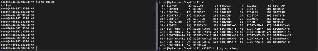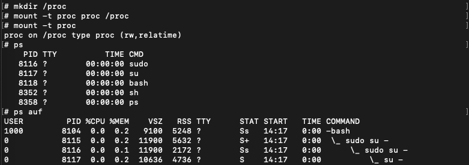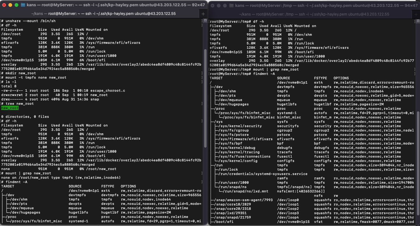 # chroot 실행한 터미널1과 호스트 디렉터리 비교