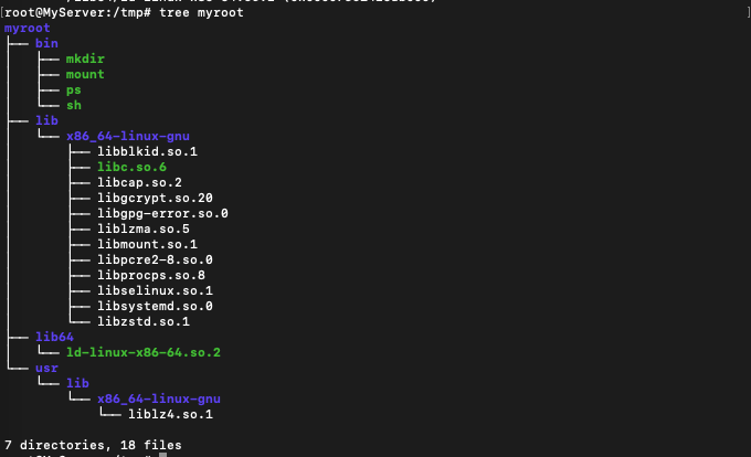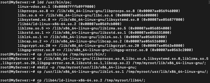 cp /lib/x86_64-linux-gnu/{libselinux.so.1,libc.so.6,libpcre2-8.so.0} /tmp/myroot/lib/x86_64-linux-gnu/;