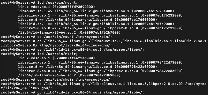 cp /lib/x86_64-linux-gnu/{libmount.so.1,libc.so.6,libblkid.so.1,libselinux.so.1,libpcre2-8.so.0} /tmp/myroot/lib/x86_64-linux-gnu/;