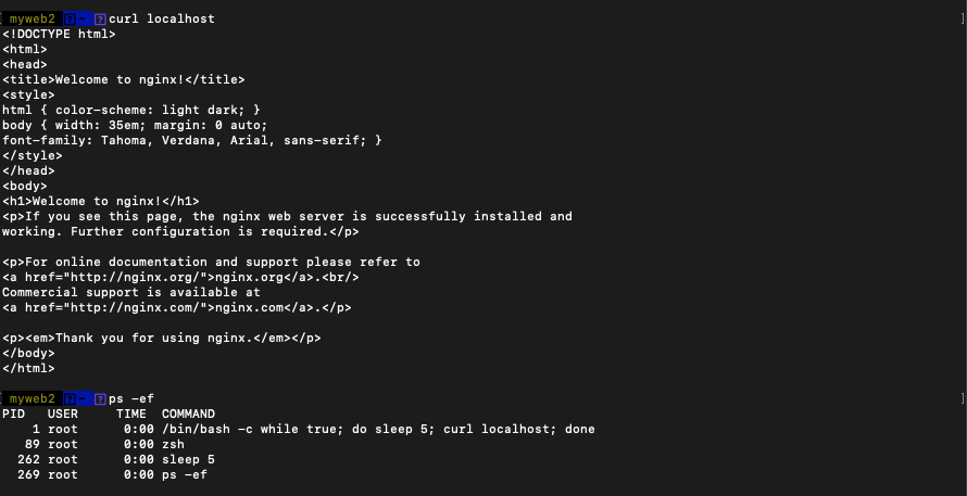 4026533617 mnt 2 2296 root /bin/bash -c while true; do sleep 5; curl localhost; done