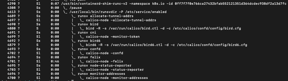 4994 ? S 0:00 | \_ bird -R -s /var/run/calico/bird.ctl -d -c /etc/calico/confd/config/bird.cfg