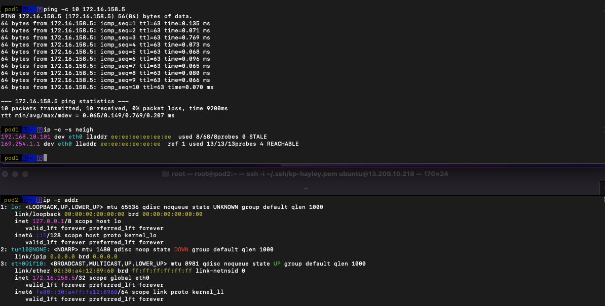 # 이때 veth 연결된 calice#~ 에 proxy arp 설정이 되어 있고, 자신의 mac 주소(ee:ee:ee:ee:ee:ee)를 알려주고, 이후 정상 통신됨