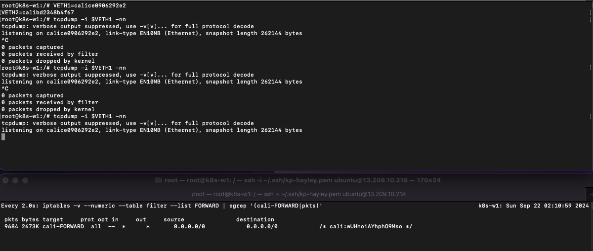 watch -d -n 1 "iptables -v --numeric --table filter --list FORWARD | egrep '(cali-FORWARD|pkts)'"