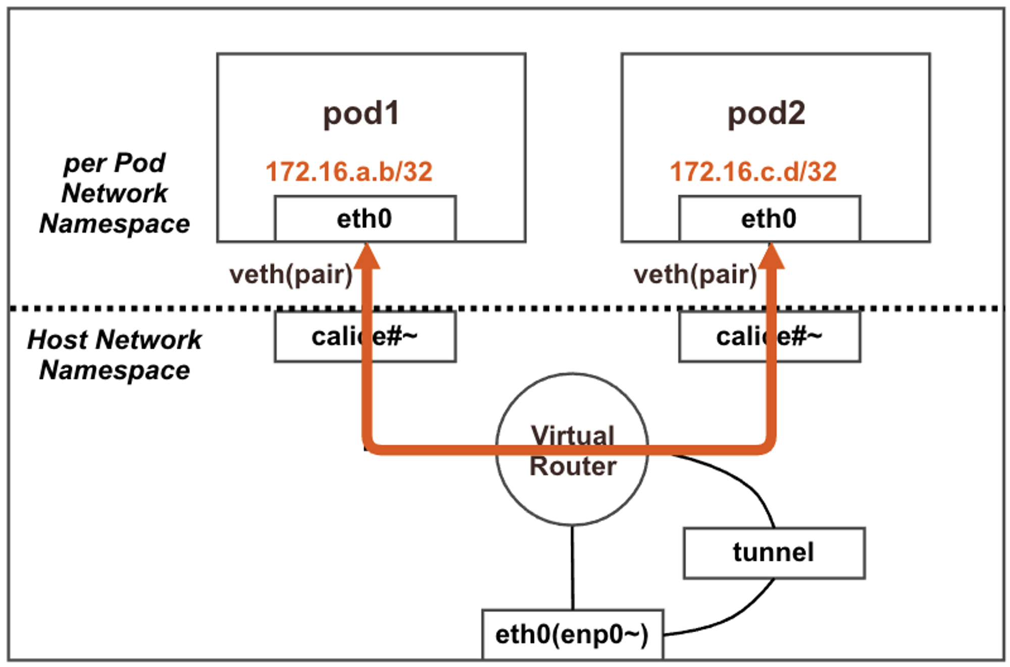 - 동일 노드 내에 파드 간 통신에서는 tunnel 인터페이스는 미 관여