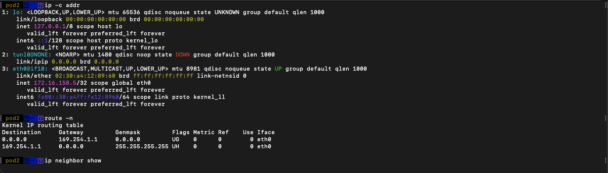 - 172.16.158.4/32 eth0@if12 인터페이스와 통신하지 않는 모든 대역은 169.254.1.1로 보낸다