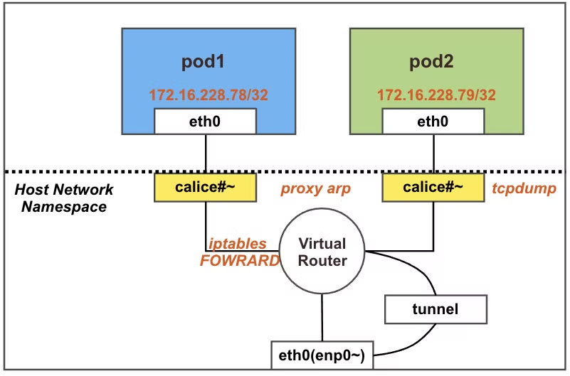 - calice# 인터페이스에 proxy arp 설정으로 파드에서 바라보는 게이트웨이의 MAC 정보를 파드가 전달 받음