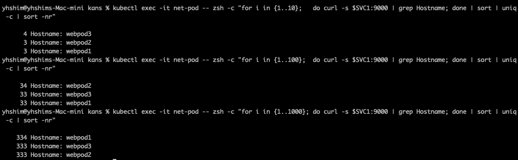kubectl exec -it net-pod -- zsh -c "for i in {1..1000}; do curl -s $SVC1:9000 | grep Hostname; done | sort | uniq -c | sort -nr"