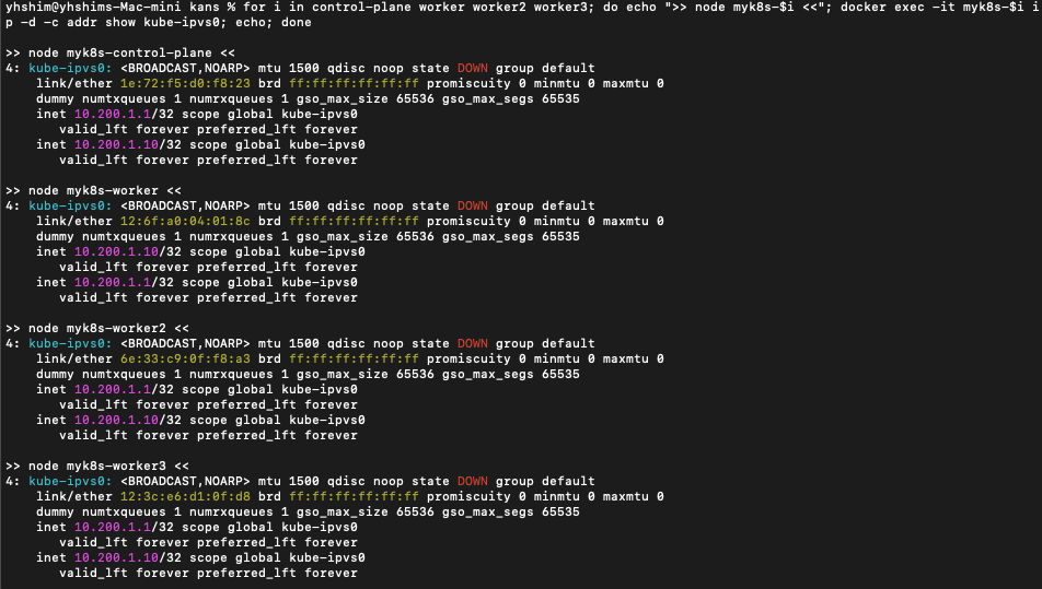 for i in control-plane worker worker2 worker3; do echo ">> node myk8s-$i <<"; docker exec -it myk8s-$i ip -d -c addr show kube-ipvs0; echo; done