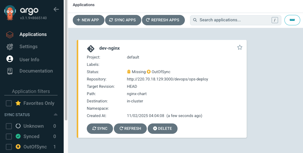 Repo(ops-deploy) 를 바라보는 ArgoCD App 생성