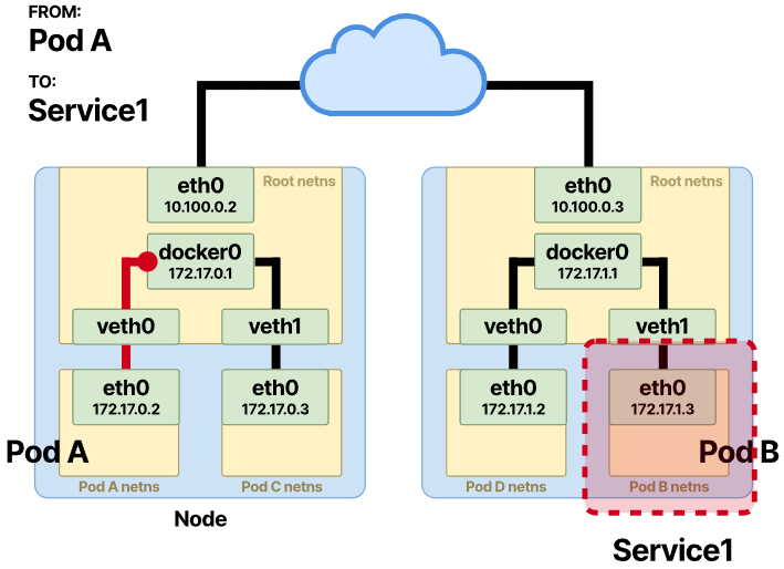요청이 Pod-A에서 시작되고 Pod-B에 도달하려고 할 때(이 경우 서비스 ‘behind’) 전송 중간에 추가 변경이 발생합니다.