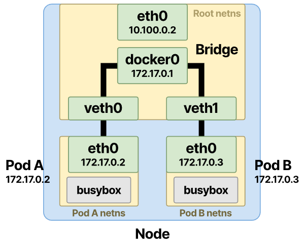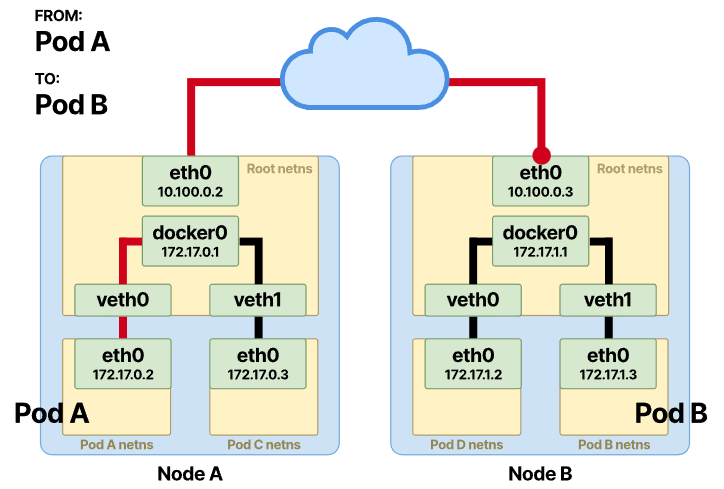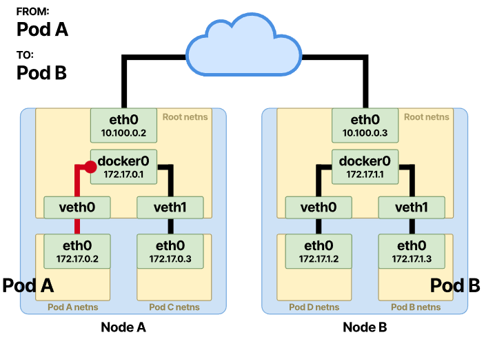 동일한 노드에 두 개의 Pod가 있고 Pod-A가 Pod-B에 메시지를 보내려고 한다고 가정해 보겠습니다.